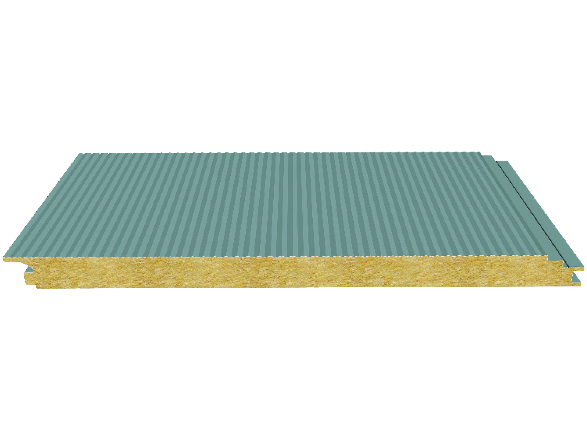 巖棉夾芯板是選用兩層高品質的彩涂涂層鋼板或其他精密壓型的金屬板做面板,輥壓成型后,將分條后的巖棉90度旋轉(使其纖維垂直于上下兩層鋼板),通過高強度、高粘結力、高防火的粘結劑,將優質巖棉與金屬板粘結、復合而成美觀、平整、剛韌的建筑板材。